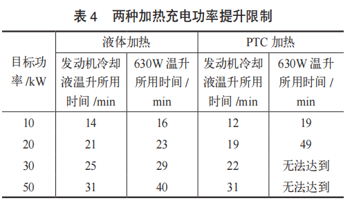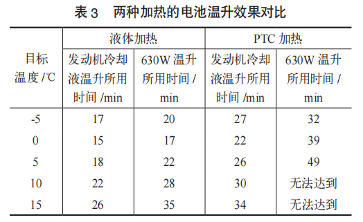某PHEV车型动力电池采用液冷加热技术和PTC加热技术进行对比应用研究,结果见表3,从电池温升和充放电功率的提升来看,使用液体加热技术要优于PTC加热技术,见表4。