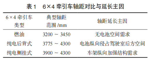 现有研究缺乏高容量电池场景下布置空间与轴距的耦合机制分析,6×4 牵引车轴距对比见表 1。