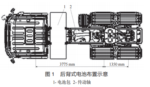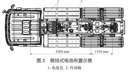 纯电重卡电池用电量较大,在重型商用车领域采 用电池价格较低的磷酸铁锂电池比较适合。由于磷酸铁锂的能量密度各厂家相差不大,对商用车来说,不同品牌的电池包尺寸趋于统一。以 400 kW · h 电池为 例,其成组方式为单包 100 kW · h,采用 2 并 2 串的方 式。电池系统的主流布置型式为后背方案或侧挂方案, 具体如图 1、图 2 所示。
