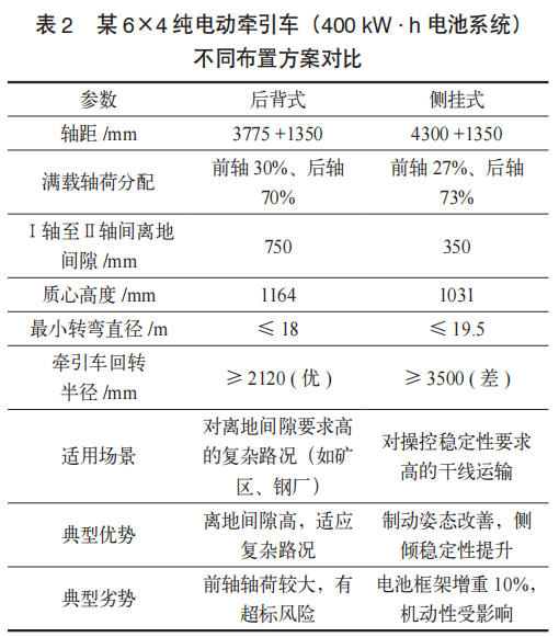 对某 6×4 牵引车型,驱动型式为中央驱动,电池 电量 400 kW · h,驾驶室后悬 815 mm 的纯电动车型, 不同布置方案对比结果见表 2。
