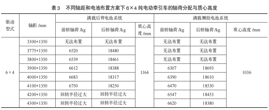 某 6×4 纯电动两款搭载 400 kW · h 电池系统的重型牵引车在不同轴距下的轴荷分析结果见表 3。