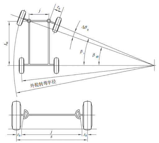 式中,L 为理论轴距(理论后部车轴中心线与前轴中心线距离,单位 mm);j 是两转向主销中心线与地面交点间距离,单位 mm ;β (a0)是理论外转角;β i 是内轮实际转角