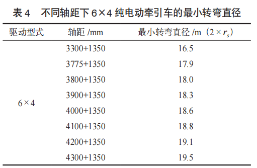 从公式 5、6 中可以直观地看出,在其他参数(如 主销偏移距和最大前轮转向角)保持不变的情况下,最小转弯直径与轴距呈正相关关系。轴距每增加 100 mm, 最小转弯直径平均增大 0.3 m,见表 4,GB/T35782- 2017《道路甩挂运输车辆技术条件》中规定半挂牵引车回转半径不应小于 2120 mm,基于市场上常规的后背 LNG 车轴距普遍在 3800 mm,最小转向直径取 18 m 可以作为评价纯电动牵引车机动性优劣的参考值。