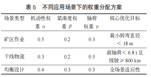 针对矿区窄路转向(机动性优先)与干线物流(载 重合规优先)场景,分别采用差异化权重策略内容见 表 5,通过 NSGA-II 算法求解 P 值最大化的帕累托最 优解集。