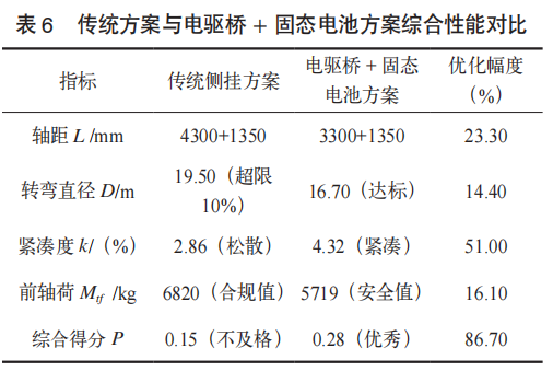 本研究提出一种“固态电池体积缩减 + 电驱桥空 间释放”协同优化策略,以解决纯电动重型牵引车因动力电池布置导致的轴距延长与转弯性能恶化问题。 通过构建量化模型与评价体系,发现应用 400 W・h/kg 固态电池可使 400 kW · h 电池包体积缩减 60%,结合电驱桥取消传动链释放的空间,实现电池立体堆叠布置。这样可使轴距缩短至 3300 mm,降幅 17.7%,回归燃油车水平;最小转弯直径降至 16.7 m,降幅14.4%, 电池布置紧凑度指数提升 51%。同时,多目标综合评价模型的 P 值从 0.15 升至 0.28,突破了电动重卡机动性与长续驶的矛盾壁垒。