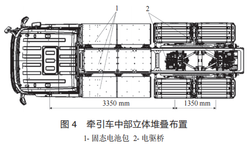 以某 49 t 的 400 kW · h 纯电牵引车为例,对比传统中央驱动与电驱桥 + 固态电池方案,基于均衡设计场景权重(α=0.4,β=0.3,γ=0.3)计算综合得分 P, 结果见表 6,电驱桥 + 固态电池布置方案如图 4 所示。