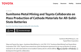 近日,丰田汽车通过全球官网宣布,已与住友金属矿山株式会社(下称 “住友金属矿山”)达成合作协议——双方将围绕纯电动汽车(BEV)用全固态电池正极材料的量产展开协作,共同加速相关技术的研发进程。