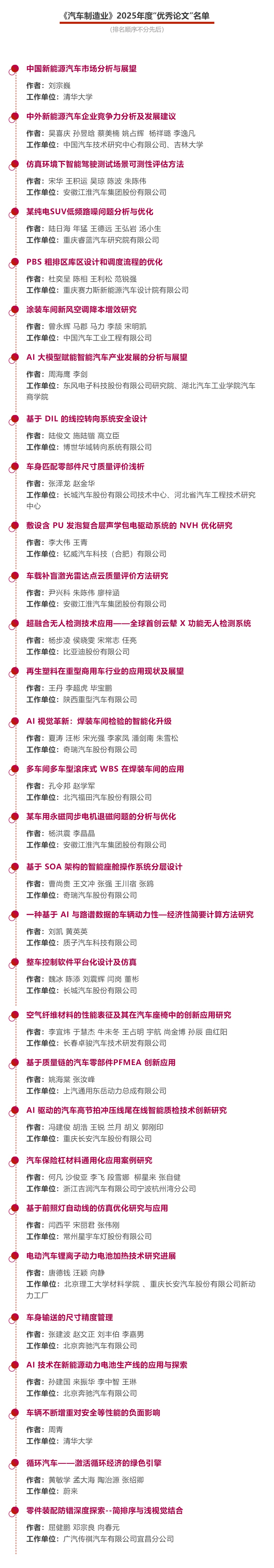 2025年,《汽车制造业》共出版6期正刊和1期增刊,刊载200余篇具有技术深度、对行业发展具有重要参考价值的原创论文。经过《汽车制造业》编辑部和编委会专家的遴选,最终评选出30篇“优秀论文”。