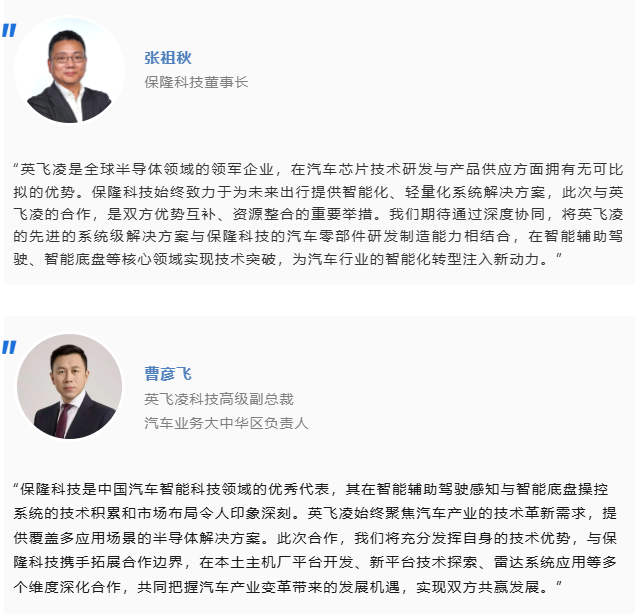 此次合作聚焦汽车安全与智能化核心领域,双方将在智能辅助驾驶和智能底盘领域加速技术迭代与商业化应用,为汽车产业提供更安全、更可靠的解决方案。未来,保隆科技将凭借在汽车零部件市场的本土化研发、全球化生产及服务优势,结合英飞凌全球领先的系统级解决方案,实现“技术互补、市场共拓”的双赢格局。