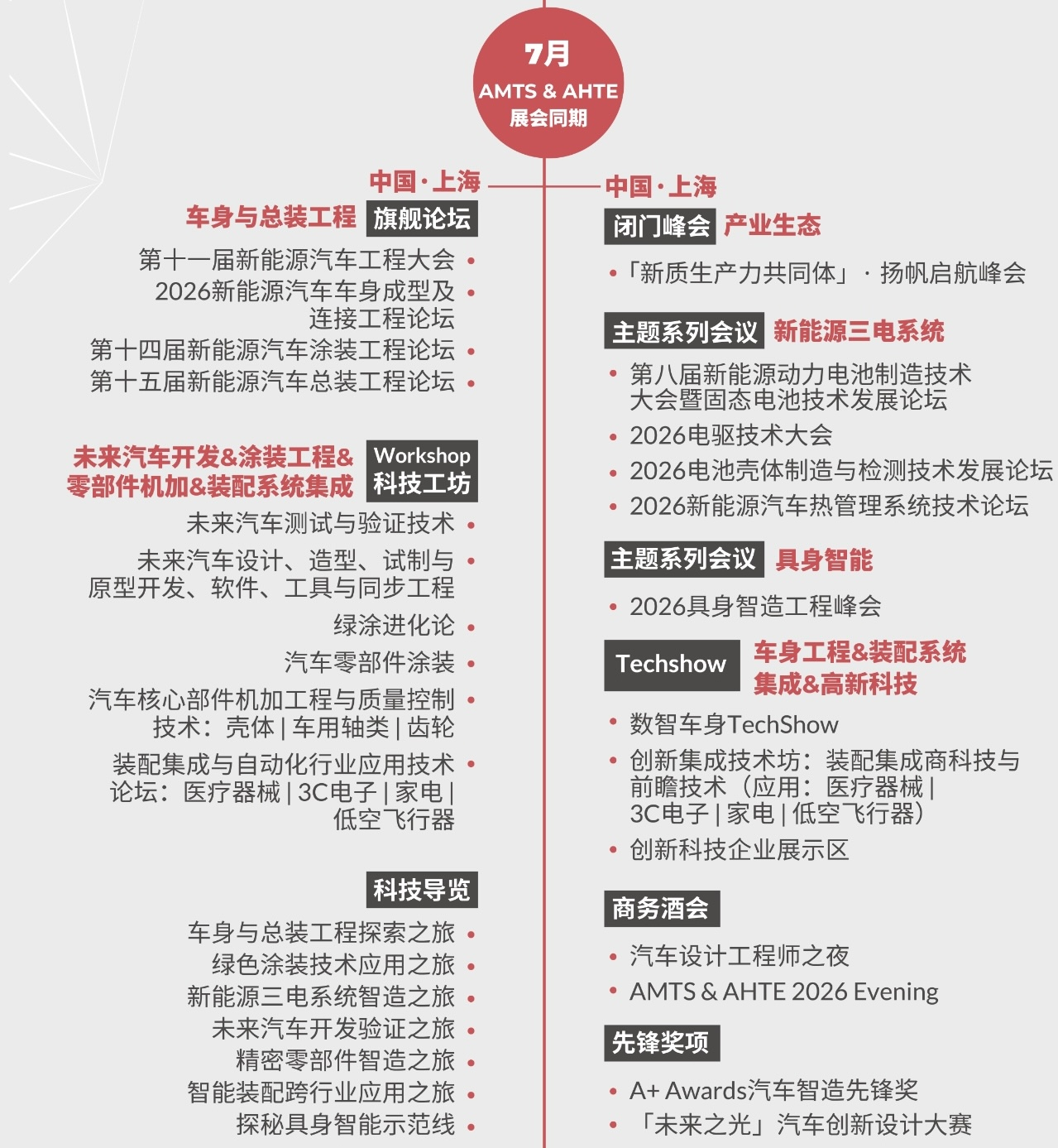 2026年,我们将推出多种活动形式,覆盖旗舰论坛、闭门峰会、主题系列会议、Workshop科技工坊、Techshow高新科技发布、圆桌对话、科技导览、扬帆出海、先锋奖项、走进智造、商务酒会等全维度活动,为您呈现一场多元化的创新生态体验。从聚焦冲焊涂总工艺的新能源工程大会、探索前瞻开发与测试技术的专业论坛,到深度研讨前沿科技的TechShow & Workshop;从沉浸式国内外智造产线工厂考察,到促进深度链接的圆桌会议、交流晚宴与精准配对,通过旗舰峰会、主题会议、Workshop科技工坊、出海及商务考察等全维度活动打造集技术洞察、知识共享与商业合作为一体的高端平台。