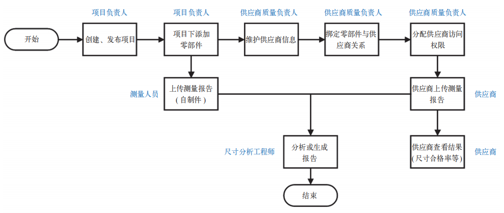业务流程如图3所示,系统涵盖所有与尺寸业务相关的角色,包含项目负责人、供应商质量负责人、供应商、尺寸分析工程师及内部测量人员,可以制定标准化作业流程,精益化管理尺寸数据。
