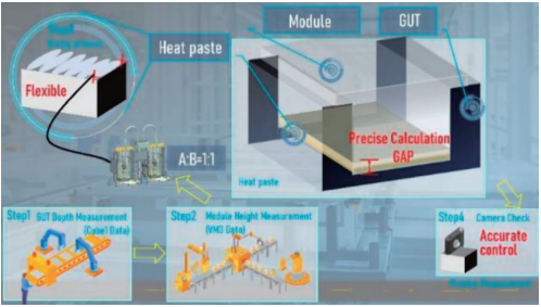 新能源电池包生产工艺过程通常包含模组开路电压检测、涂胶、拧紧、氦气检测以及尾线检测等工艺步骤。其中涂胶种类包含导热胶、固定胶和密封胶。高质量导热胶涂胶过程对于电池包热管理至关重要,呈现五个特点。