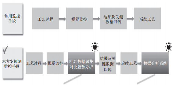 相比于常规的监控手段,本方案加入了PLC数据采集对比、趋势分析等技术方案,同时建立数据分析系统,对采集过程的图像进行数据分析判断。常规监控方案和本项目规划监控方案技术路线对比如图3所示。