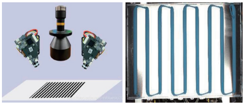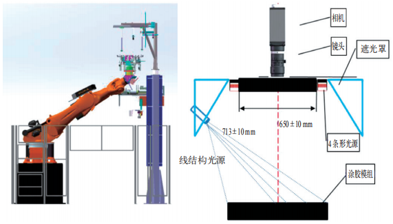 如图4所示,通过3D建模及仿形设计出符合现场的相机支架,部署多排结构光和2000万像素彩色相机,实现涂胶体积、平面尺寸的高精度测量(检测距离远、抗光照干扰)。