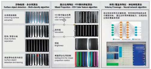 本系统检测距离远,不受光照影响成像精度。算法方面,采用多分类算法实现对涂胶异物检测,如图8所示,采用HSV颜色特征算法进行混合比例判定,采用神经网络算法进行体积覆盖率判定。