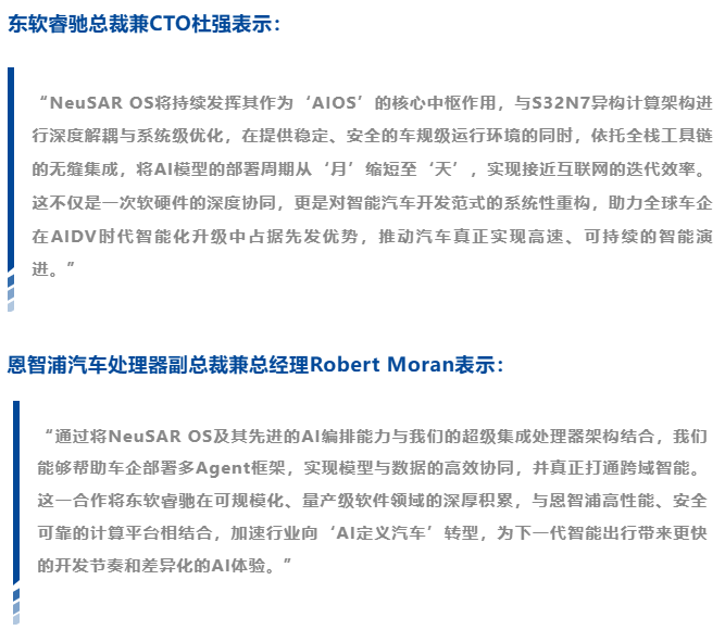 在此次合作中,NeuSAR OS与NXP S32N7的高性能异构计算架构深度融合,共同打造面向汽车量产级的车规Agentic AI技术环境,并围绕系统架构验证、软件深度集成以及产业生态协同等方面持续推进方案成熟落地,构建可长期演进的整车级AI创新基础平台。