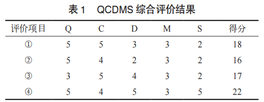 归纳总结已知的零件装配防错技术手段有:条形码与二维码扫描比对信息;电检读取电器件内置信息比对;按灯指示拿取零部件;视觉检查比对零件信息。结合工厂零件特征、工艺条件和设备资源利用情况等,考虑改善后预期效果、实现成本、花费周期、人员劳动负荷及安全性等,运用QCDMS综合评价方法进行了分析。QCDMS综合评价方法简要说明如下,其结果如表1所示。