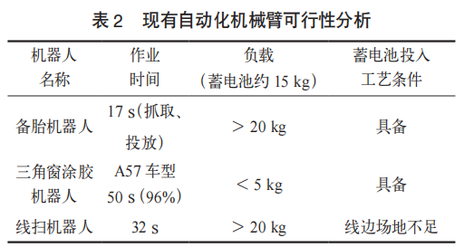 我们对工厂内现有设备进行了分析,筛选出利用率不足80%的设备,并评估了其工位是否满足投放蓄电池的基本工艺条件。结果表明,只有“备胎机器人”符合改造条件,具体可行性分析见表2。最终,我们决定将“备胎机器人”改造为兼具蓄电池自动抓取功能的设备,并以此确立为本项目的改善方向。
