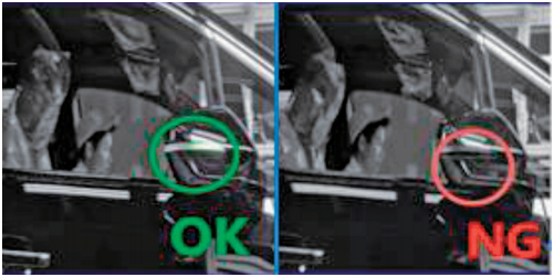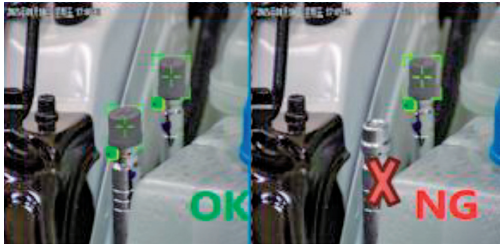 模型匹配检测是指通过将待检测目标与预先建立的标准模型(模板)进行比对,来判断目标是否符合要求或识别其类型的技术。其核心原理是先基于已知的标准目标(如合格产品、特定图案等)构建模板,检测时将实时采集的图像与模板进行像素级或特征级的匹配计算(如计算相似度、差异度等),根据匹配结果判断目标是否存在、是否符合标准。例如,在生产线上通过匹配零件模板来检测产品是否存在缺件或破损,或在图像识别中通过模板匹配来定位特定的标识符。这种技术依赖模板的准确性,适用于目标形态相对固定的场景,优点是原理直观、实现相对简单。如图2所示,该技术被应用于汽车空调制冷剂加注口盖子漏装的检查。