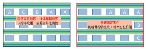 现有蓄电池合计5种,原重力3滑移辊道2组并列放置形成6个放置位。每种零件被固定放置于指定的辊道上,机械臂再根据制造执行系统(MES)下发的任务指令,从对应辊道抓取特定型号的部件,从而确保取用零件的准确性。如图8所示为2种排序方式对比说明。