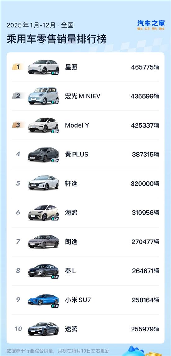 2025年已经结束,过去一年中国市场卖得最好的10款乘用车车都是谁?汽车之家做出了统计。