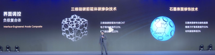 负极则通过界面调控形成复合体:三维硅碳前驱体掺杂CNT,提升电子导电率20%,降低膨胀率20%;石墨表面功能性基团修饰,提高锂离子扩散系数50%,降低膨胀5%,复合使用下电芯功率提升30%,膨胀降10%。