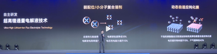 电解液创新包括弱配位-小分子复合溶剂,降低脱溶剂化能垒和界面阻抗,提升离子电导率,使充电能力升15%;以及动态自适应钝化膜,通过不饱和磷酸酯交联聚合,形成高弹性钝化层,提升循环寿命15%,降低产气40%。