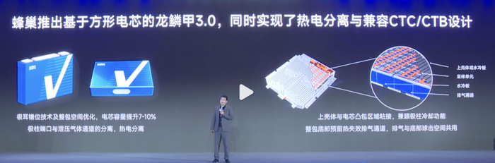 蜂巢能源的前两代龙鳞甲基于短刀电芯,而第三代转向方形电芯,在热电分离的同时,提升结构性能,并兼容CTC/CTB整车架构。