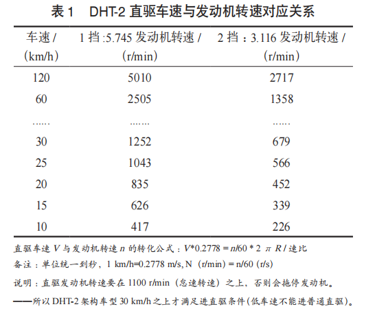 DHT-2混合动力架构如图1所示。其前桥变速器具备2个挡位(1挡速比5.745,2挡速比3.116),连接一个电机和一个发动机(电机与发动机之间通过离合器连接,速比为1.963)。由于该架构变速器挡位较少,且1挡速比相对较小,在低车速下直接驱动会导致发动机转速过低甚至熄火。因此,该架构不支持全车速范围的发动机直驱,通常需要车速高于30km/h才能进入直驱模式,见表1。后桥则一直固定在1挡,连接一个后电机。