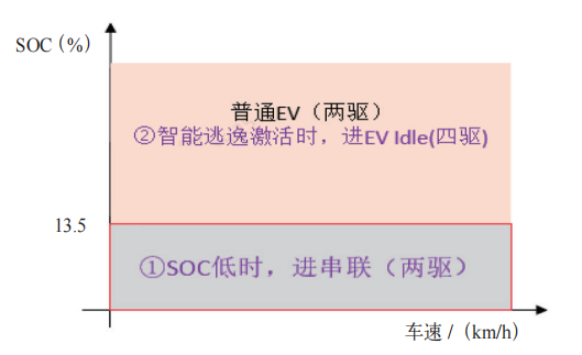 (2)智能逃逸激活:当后轮打滑时,若车辆未处于直驱模式且SOC并非极低,系统会强制目标操作模式进入EV Idle四驱模式,如图2所示。