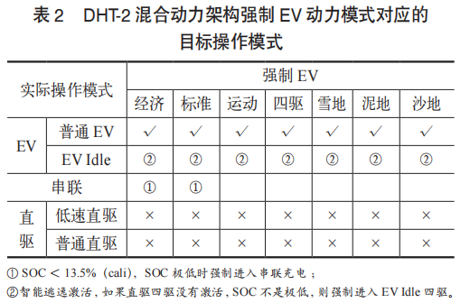 DHT-2混合动力架构在强制EV动力模式下对应的目标操作模式总结见表2。