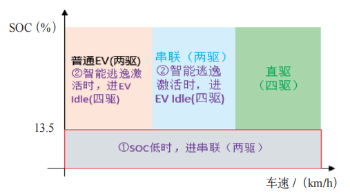 (1)SOC极低:当SOC低于特定阈值(例如,基于温度标定,SOC<13.5%)时,为防止动力电池电量耗尽,系统会强制起动发动机,并请求目标操作模式进入串联模式,由发动机带动前电机为动力电池充电。