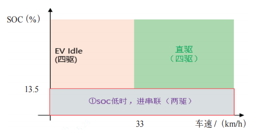 如图4所示,当驾驶模式为四驱模式、泥地模式或沙地模式时(即驾驶员意图为四驱),发动机始终保持起动状态。车速低于30km/h时,目标操作模式为EV Idle;车速高于33km/h时,目标操作模式进入直驱。