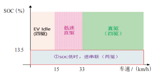 实际操作模式为普通EV对应的驱动方式为EV后驱,EV Idle对应驱动方式为EV四驱,动力电池均处于放电状态;串联对应的驱动方式为EV后驱,动力电池处于充电状态;低速直驱与普通直驱对应的驱动方式均为混动四驱,发动机一直在驱动,动力电池可保电,见表4。