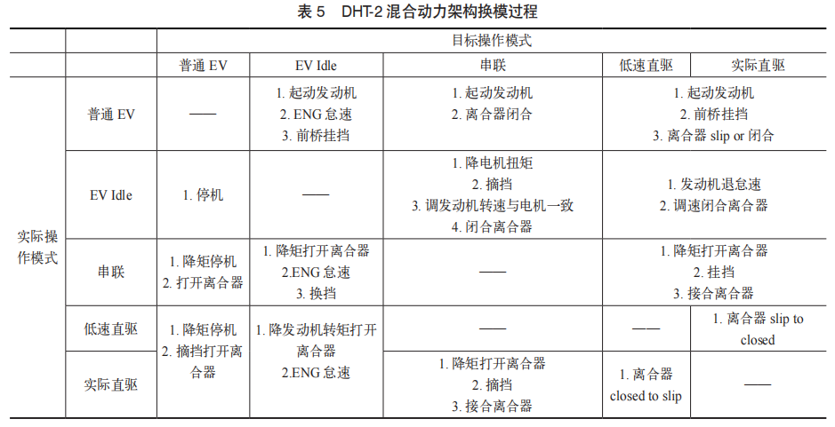 例如,若当前模式为“EV Idle”,目标模式为“串联”,则整车控制器会请求降低电机转矩,并请求TCU挂入N位。随后,在调整发动机转速与电机转速同步后,TCU将闭合离合器,整车控制器随即使系统进入串联模式。
