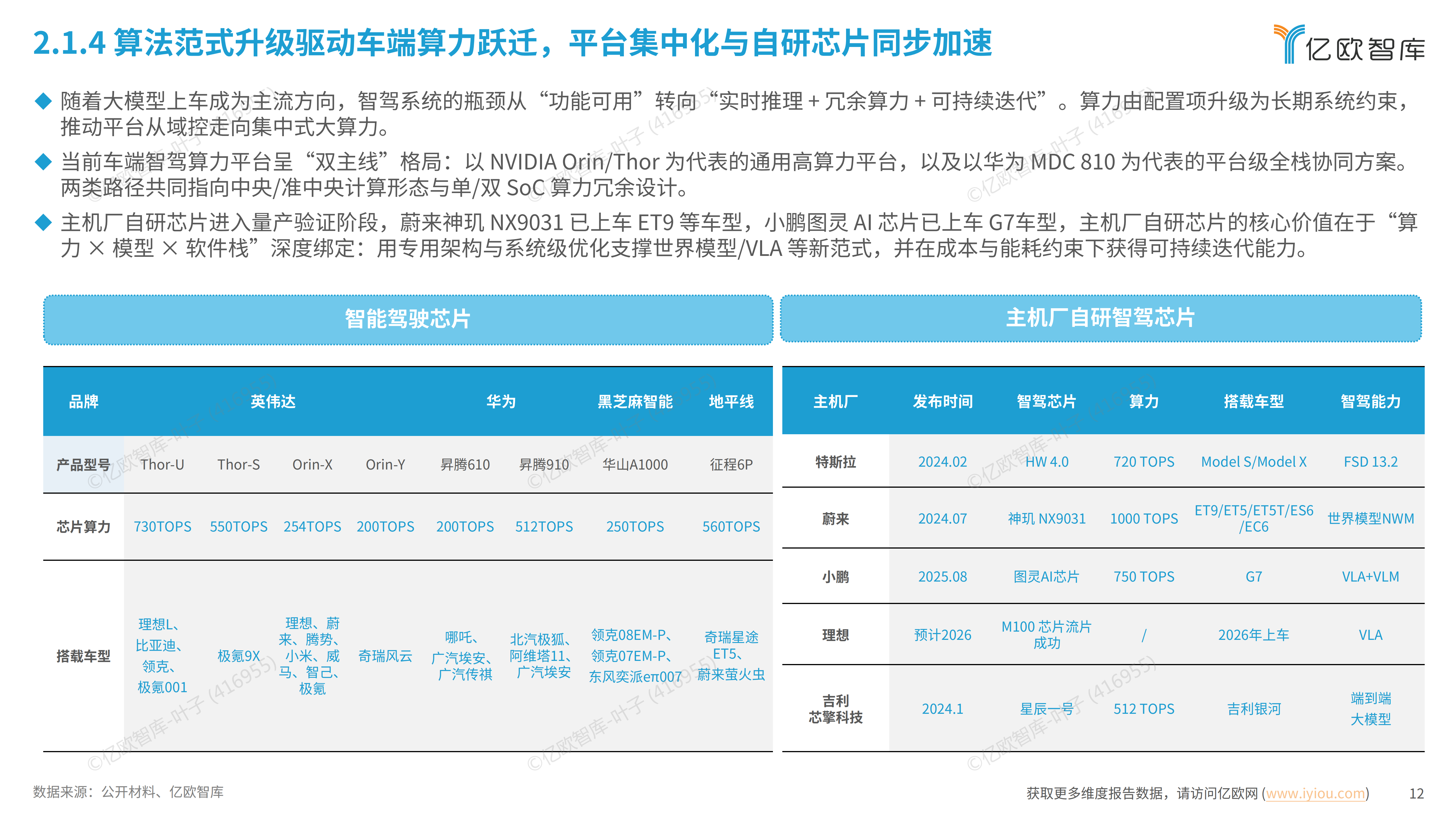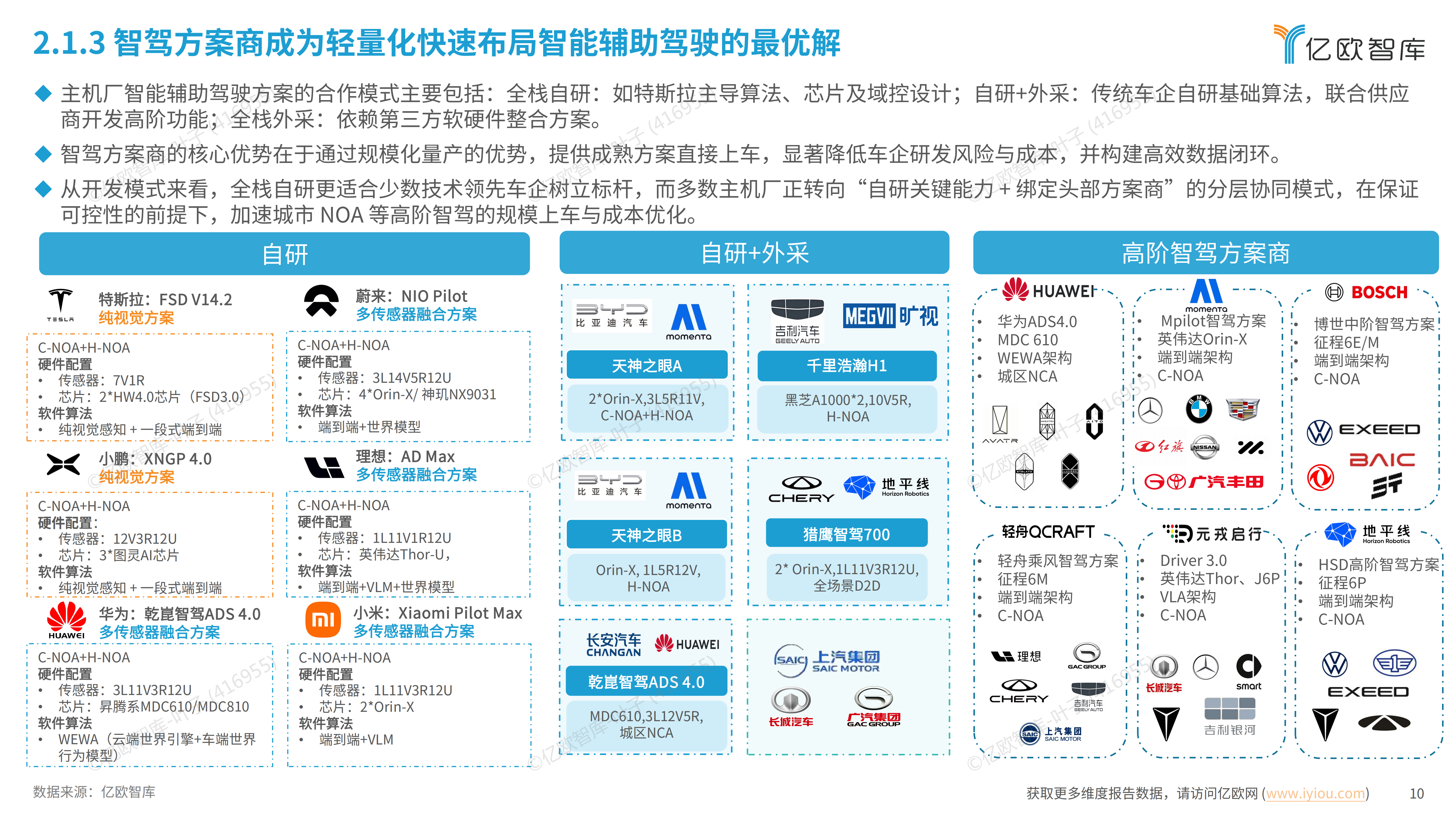 ●智能驾驶方面,2025年,中国智能驾驶进入"规模上车+场景运营"加速期。城市NOA正在由高端型,快速渗透到15万元左右的主流价位区间,主机厂普遍采用"自研关键能力+绑定头部方案商"的协同研发模式加速智驾方案上车。