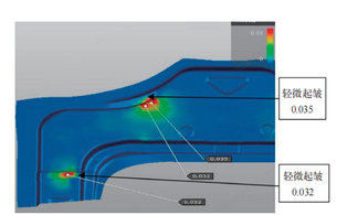 产品首次冲压提样阶段,因前期冲压SE识别风险不充分,导致实际提样过程中,前舱竖板本体局部起皱,现有冲压模具结构无法解决,导致表面产品质量不合格。后期通过对前舱竖板本体SE分析验证,增加产品凸台造型,同时局部设计变更冲压模具内部结构,从而解决了前舱竖板起皱的难题,满足了产品要求,对后续新车型的产品开发,提供了一种新的解决思路。