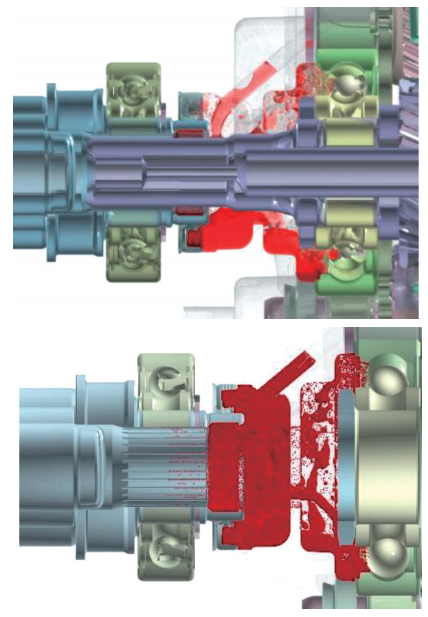 对优化后的结构进行CFD流体仿真分析,如图6所示。结果显示,润滑油回流的速率大幅度降低,更多的润滑油被储存在壳体局部空间内,花键的湿壁面积提高,温度明显降低。