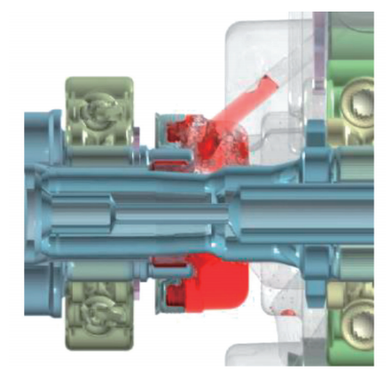 由于电机和减速器为独立的腔体,花键处的冷却仅靠减速器的润滑油完成。对电驱数模进行简化,进行CFD流体仿真分析,如图4所示,计算花键处的润滑油量。仿真结果显示花键处的润滑油流量为0.18L/min,湿壁面积为2.5%,该处设计满足花键的润滑要求。从仿真过程可知,虽然流向此处的润滑油量较大,但仅有少量的润滑油进入花键间隙完成润滑,大部分润滑油受限于壳体结构,在花键轴下方短暂停留便通过壳体孔回流至减速器内腔中,因此未达到冷却的目的。通过试验验证,花键处的润滑油量不足以冷却电机产生的异常高温。因此初步锁定锈蚀的根因为润滑油无法冷却花键处的异常高温。