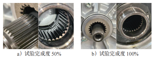 对样机加注要求的润滑油量进行润滑试验,试验完成后拆机检查,齿轮、轴承均未出现润滑不良问题,且检查发现花键处存在润滑油,说明在非连续正反驱工况下,要求加注的润滑油量满足花键处的润滑要求,故排除加油量不足的影响。
