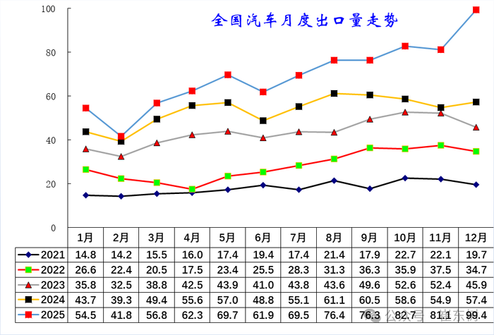 2025年全年中国汽车实现出口832万辆,同比2024年全年增速30%,12月中国汽车实现出口99万辆,同比增73%,环比增23%,同比和环比走势总体较强。今年的主要动力仍是中国产品竞争力提升和全球南方国家市场的小幅增长,但俄罗斯车市低迷的影响较大。