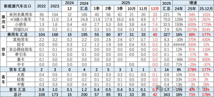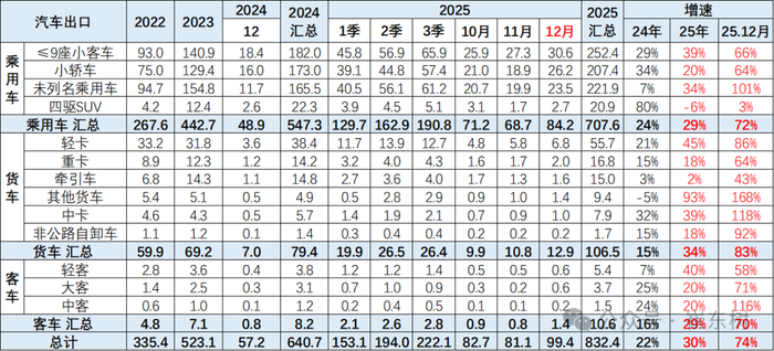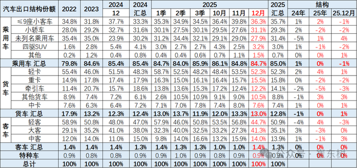 乘用车内部的几类主力车型表现较均衡,2025年表现改善的是未列名乘用车的出口,虽然季度末特斯拉出口回落的影响较大,但自主的电动车增长较好。2025年9座以下客车占比36%,其中12月降到36%。