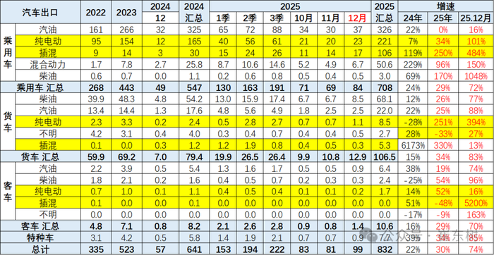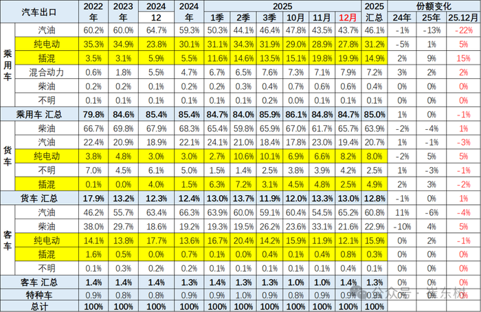 2025年全年乘用车的纯电动的占比回升,汽油乘用车和柴油货车、汽油客车出口下降较大。12月的插混乘用车、插混皮卡和混动乘用车出口较好增长。