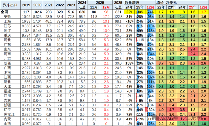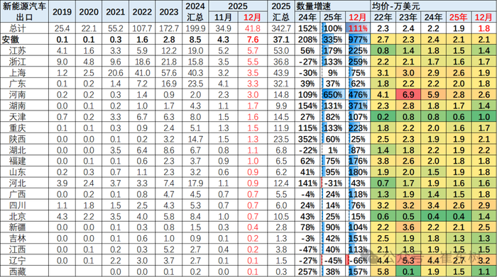 2025年新能源汽车出口比较强的地区是江苏、上海、安徽等。天津、北京等出口均价较低,应该是无VIN码车型为主。