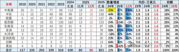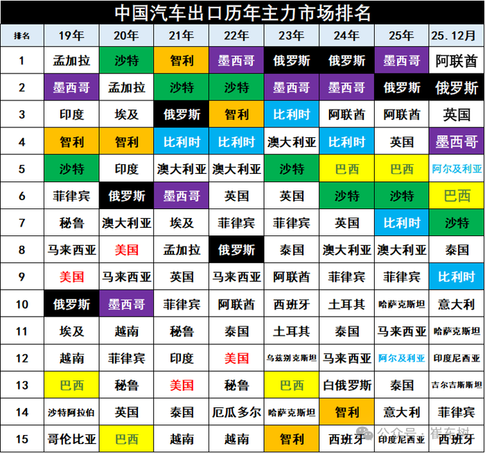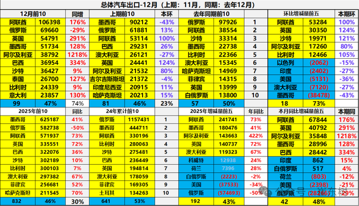 2025年全年汽车出口结构变化,墨西哥上升到出口第一地位,阿联酋的出口提升。12月对阿联酋的出口回升到第1位。英国市场较好,澳大利亚的出口排名稳定,巴西出口同比下降。