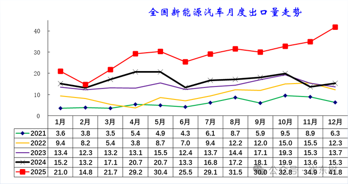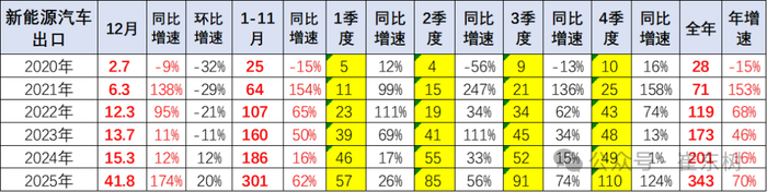 在连续高增长后,2024年全年新能源汽车累计出口量201万辆,同比增长16%。2025年12月中国新能源汽车出口42万辆,同比增长174%,表现很好;2025年全年新能源汽车出口量343万辆,同比增长70%,增速高于2024年全年的16%较多。
