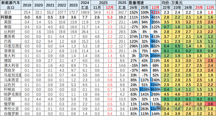 2025年12月中国新能源汽车出口总量的前10国家:阿联酋53326辆、英国36708辆、泰国24905辆、比利时22673辆、墨西哥21986辆、巴西21523辆、印度尼西亚19968辆、菲律宾14710辆、意大利14048辆、德国11531辆,其中本期较同期增量增大的前五个是:阿联酋43814辆、英国29287辆、巴西19284辆、墨西哥17701辆、印度尼西亚17241辆。2025年全年中国新能源汽车出口总量的前10国家:比利时284921辆、英国231181辆、墨西哥221027辆、巴西200825辆、菲律宾200544辆、阿联酋191946辆、泰国151633辆、澳大利亚145781辆、印度尼西亚126536辆、印度102691辆,其中本期较同期增量增大的前五个是:墨西哥140597辆、阿联酋115230辆、英国111928辆、菲律宾86122辆、印度尼西亚73382辆。