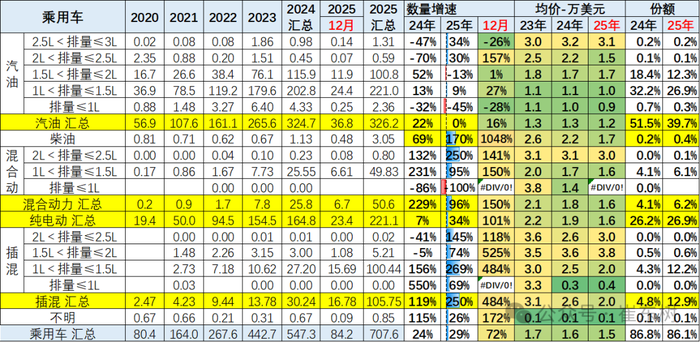 乘用车出口的排量在1升-1.5升区间为主体,这也是中国自主乘用车的产品综合优势。2025年的1.5-2升车型下滑剧烈。前期1.5-2升车型出口增长较快,说明俄罗斯等更需求中国的高端高价SUV车型,但俄罗斯市场暂时低迷,1.5-2升压力更大。