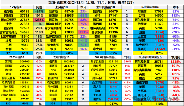 中国燃油乘用车2025年12月出口规模最大的是俄罗斯60128辆、阿联酋37792辆、阿尔及利亚27817辆、沙特27333辆、墨西哥17693辆、吉尔吉斯斯坦14695辆、哈萨克斯坦13640辆、埃及10774辆、巴西9845辆、智利9736辆,其中本期较同期增量增大的前五个是:阿尔及利亚25734辆、阿联酋19031辆、吉尔吉斯斯坦7945辆、英国5217辆、巴西4204辆。