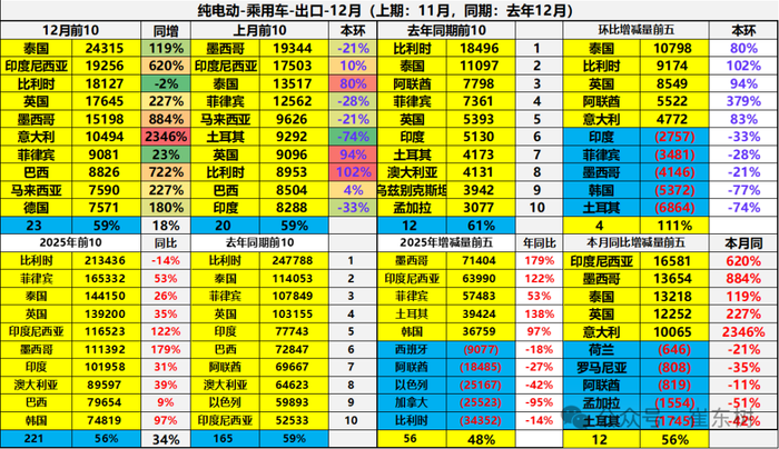 中国纯电动乘用车2025年12月出口主要是泰国24315辆、印度尼西亚19256辆、比利时18127辆、英国17645辆、墨西哥15198辆、意大利10494辆、菲律宾9081辆、巴西8826辆、马来西亚7590辆、德国7571辆,其中本期较同期增量增大的前五个是:印度尼西亚16581辆、墨西哥13654辆、泰国13218辆、英国12252辆、意大利10065辆。